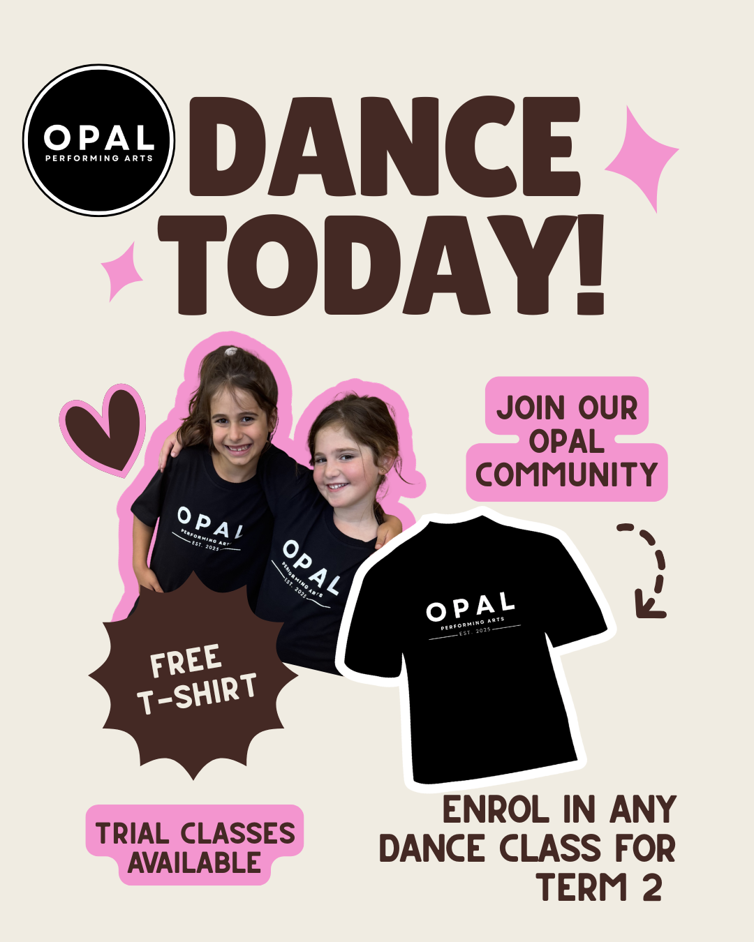 Enrol in Term 2 and receive a FREE Opal Performing Arts t-shirt!